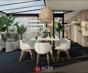 Jeśli chodzi o ogród na dachu projekt został stworzony z myślą o różnorodnych potrzebach mieszkańców. Znalazła się w nim strefa relaksu z przestronną balią spa i wygodnymi leżakami, idealna do regeneracji po intensywnym dniu. Osobną część stanowi strefa kulinarna z nowoczesnym grillem i urządzeniami do gotowania — prawdziwe serce towarzyskich spotkań. Uzupełnieniem aranżacji jest elegancka strefa jadalniana, która w sezonie letnim staje się rodzinną jadalnią pod chmurką. Poszczególne strefy zostały zaprojektowane w taki sposób, by płynnie się przenikały, tworząc spójną, komfortową i estetyczną całość.