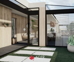 Kluczowym elementem tej realizacji jest lekka, przeszklona oranżeria, pełniąca funkcję całorocznego ogrodu zimowego. Dzięki niej mieszkańcy mogą korzystać z uroków zieleni bez względu na porę roku czy pogodę. To przestrzeń, która sprzyja zarówno pracy zdalnej, jak i kameralnym spotkaniom czy relaksowi wśród roślin. Wprowadzenie zieleni na dach wpłynęło nie tylko na estetykę przestrzeni, ale również na mikroklimat — ograniczyło nagrzewanie tarasu latem i poprawiło komfort jego użytkowania przez cały rok.